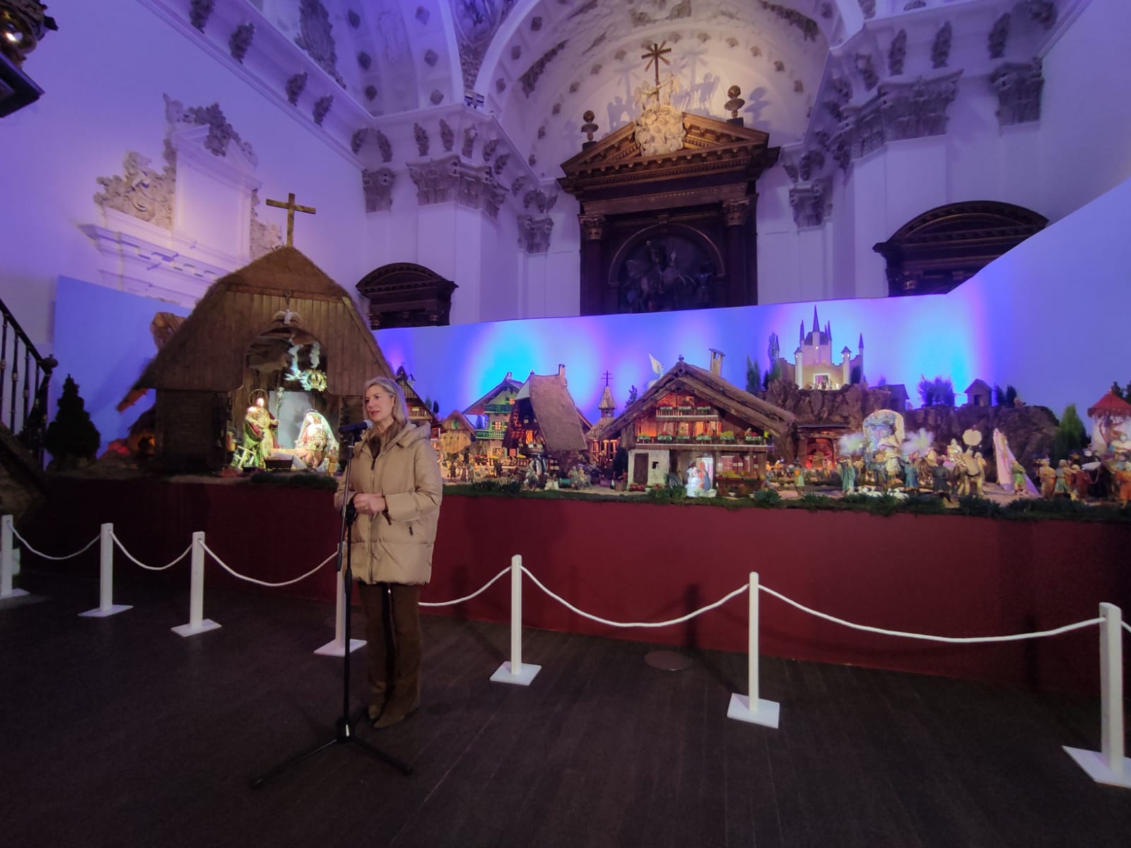 La concejala de Educación y Cultura, Irene Carvajal, acompañada por el belenista Alejandro Angulo, ha inaugurado esta mañana el belén monumental de la Sala Municipal de Exposiciones de Las Francesas-Fundación Municipal de Cultura, un montaje de cerca de 40 m2 inspirado en la aldea austriaca Christkindl (Cristo Niño).