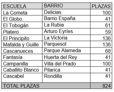 El total de plazas que el Ayuntamiento de Valladolid ofrece de 0 a 3 años en sus once Escuelas Infantiles Municipales asciende a 824, con la siguiente distribución: